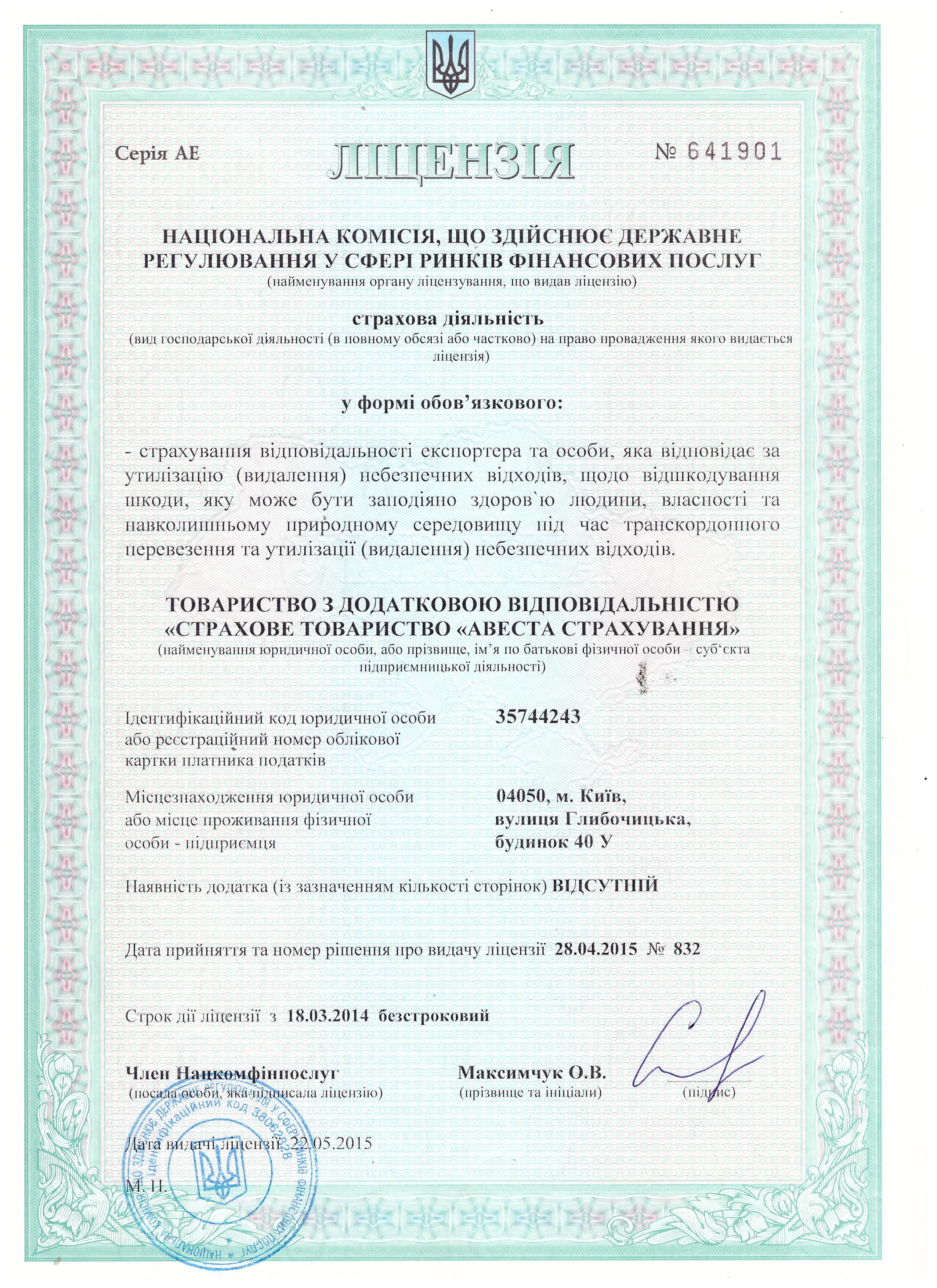 Ліцензія АЕ № 641901 від 28.04.2015 р.